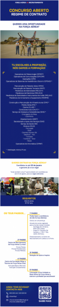 A Força Aérea encontra-se com concurso aberto para o recrutamento de jovens com idades entre os 18 e os 27 anos, disponibilizando um total de 543 vagas. O período de candidatura decorre até ao dia 30 de janeiro de 2026.